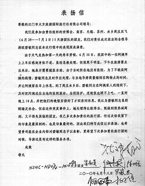 团友表扬信
