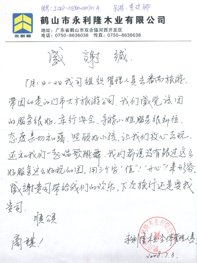 鹤山永利隆木业有限公司表扬信