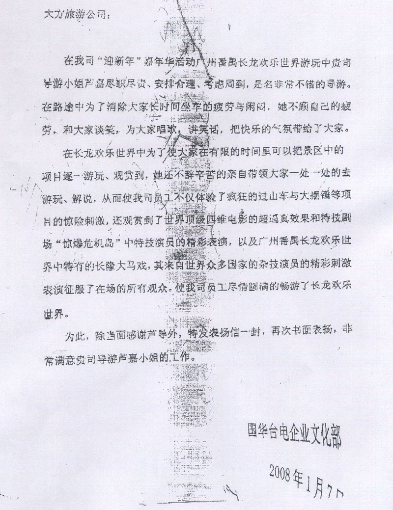 国华台电企业文化部表扬信